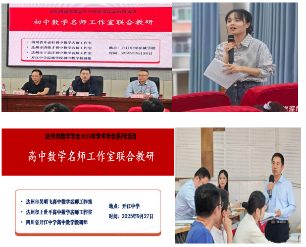 本次年会期间,四川省牟必轩初中数学名师工作室,达州市唐俊才、于志洋初中数学名师工作室,达州市王世平、吴明飞高中数学名师工作室分别在开江中学淙城学校和开江中学进行了初高中数学联合教研活动。