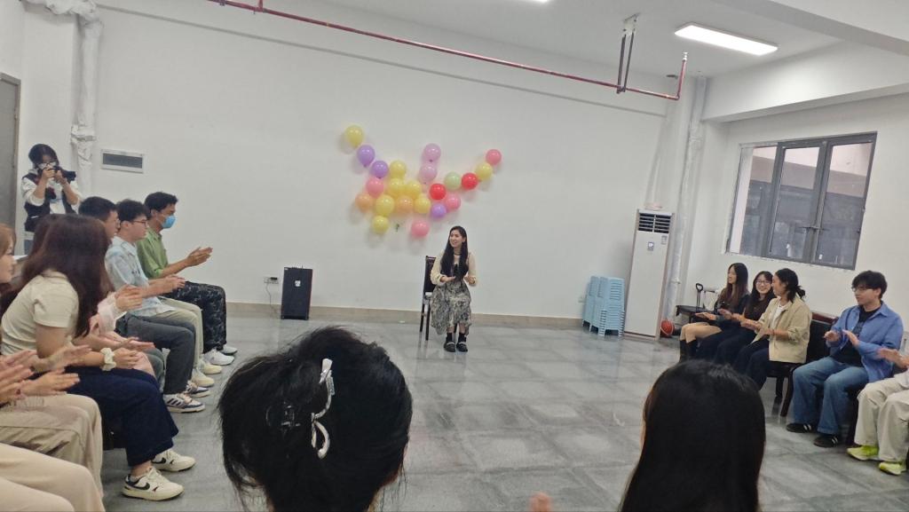 活动以“节奏自我介绍”开场:同学们用拍手、跺脚创作专属节奏,报出姓名时全场模仿,陌生感在节拍与笑声中消散。随后“桃花朵朵开”游戏点燃氛围,夏涌繁喊出“开5朵”“开3朵”,同学们飞速组队,未组队者俏皮模仿小动物叫,欢笑声冲淡学业紧绷感。