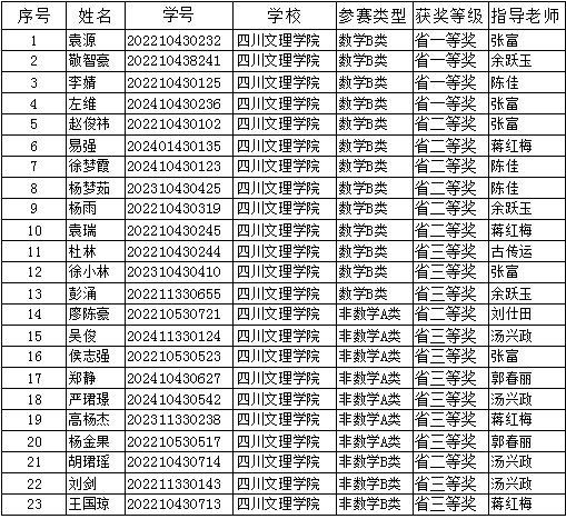 近日,第十七届全国大学生数学竞赛初赛获奖名单正式揭晓。四川文理学院学子凭借扎实的数学功底和突出的竞赛实力,在激烈角逐中脱颖而出,斩获省级奖项23项。其中,省级一等奖4项、省级二等奖8项、省级三等奖11项,充分展现了我校学子优良的学科素养与竞技风采。